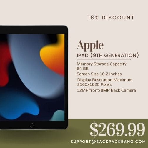 Backpack offers an amazing 18% discount on Apple iPad (9th Generation), at a deal price of $269.99.