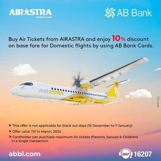 Buy Air Tickets from AIRASTRA and enjoy 10% discount on base fare for Domestic flights by using AB Bank Cards.