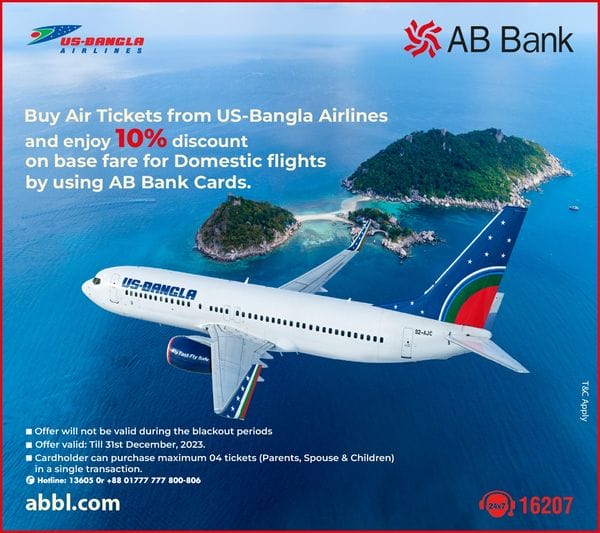 AB Bank Offers 10% Discount on Air Tickets from US-Bangla Airlines (August 2023) August 1, 2023 / Travel Buy Air Tickets from US-Bangla Airlines and enjoy 10% discount. Offer not valid during blackout periods. Cardholders can purchase a maximum of 4 tickets in a single transaction. Validity: December 31, 2023 Call: 09678-916207 Facebook Page: https://www.facebook.com/abbanklimited Website: https://abbl.com/