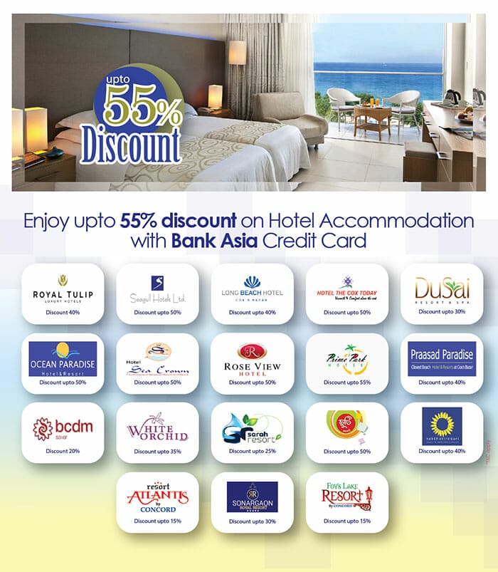 Get ready for an incredible offer! With your Bank Asia credit cards, you can now enjoy an amazing discount of up to 55% on hotel accommodations at partnered hotels, including The Royal Tulip, Ocean Paradise, Rose View, and many more.