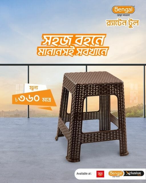 Experience luxury and sophistication no matter where you are with the exquisite Bengal Rattan Stool designed by Bengal Plastics. Its seamless design blends into any environment effortlessly. Grab yours now at just TK.360 and add a touch of sophistication to your space.