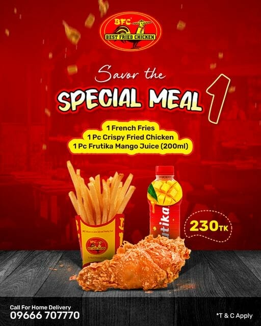 Dive into a mouthwatering special meal, starring 1pc Crispy Fried Chicken, 1 French Fries, and a refreshing 200ml Mango Juice, all at Tk.230, only in BFC.