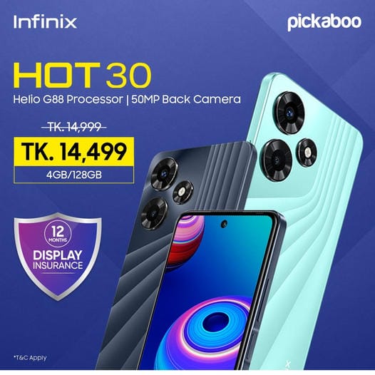 Pickaboo offers Infinix HOT 30 (4/128GB) at a reduced price of TK.14,499, from a market price of TK.14,999. Enjoy a superior gaming experience with the Helio G88 Octa-Core Gaming Engine and a 90HZ refresh rate.