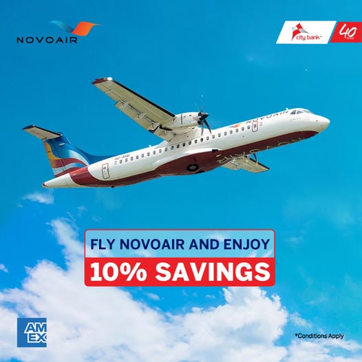Save 10% on all base fares for international and domestic flights when you buy your air tickets from NOVOAIR using your City Bank American Express Card. Simply use the promo code VQAMEX23Q1 to avail the offer.