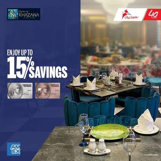 Indulge in the most exquisite culinary delights at Signature by Khazana and experience remarkable savings of up to 15% with your City Bank American Express Platinum and Gold Credit Card.