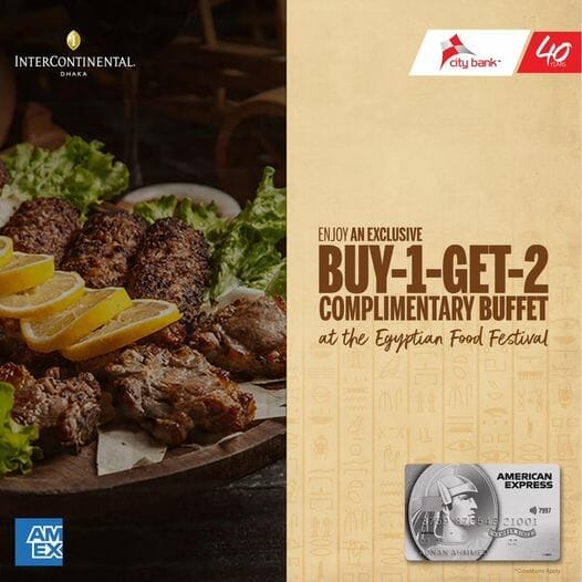 Enjoy a wide selection of world-class Egyptian cuisine at the Egyptian Food Festival in Elements restaurant, InterContinental Dhaka. Enjoy a Buy-1-Get-2 Complimentary buffet with your City Bank American Express Platinum Credit Card.