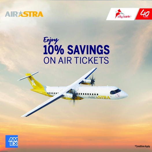 Get a 10% discount on domestic air tickets from Air Astra when you buy them at their sales outlets with City Bank American Express Cards.