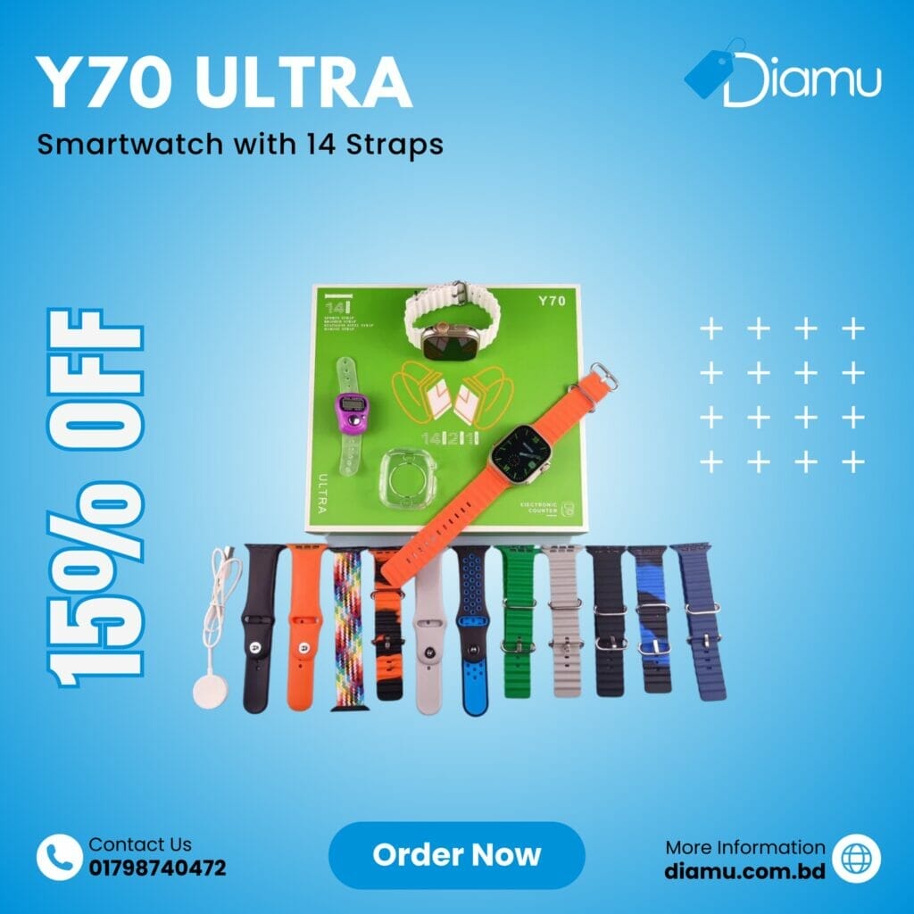 Upgrade your style and stay connected with the Y70 Ultra Smartwatch, now with 14 interchangeable straps to match every occasion. Enjoy a 15% discount and redefine your fashion-forward tech accessory game. Elevate your wristwear today!