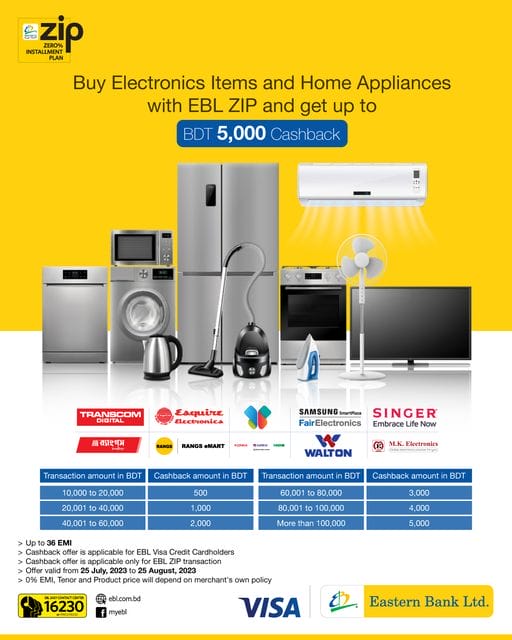 Get up to BDT 5,000 cashback when you buy electronics and home appliances from our partner stores like Transcom Digital and Singer with EBL ZIP.