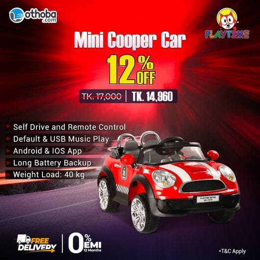 Let your children enjoy their leisure time to the fullest with Playtime’s Mini Cooper Car! Order now from Othoba.com and avail 12% flat discount, free delivery, and 0% EMI offer. Experience unmatched excitement and fun for your kids!