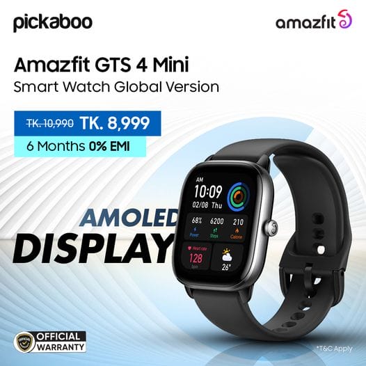 Pickaboo Offers Amazfit GTS at TK. 8,999 (July 2023) July 9, 2023 / Electronics Buy Amazfit GTS 4 Mini Smartwatch from Pickaboo at a reduced price of TK. 8,999. *T&C Apply Validity: N/A Call: 09666-745745 Facebook Page: https://www.facebook.com/pickaboocom Website: https: https://www.pickaboo.com/