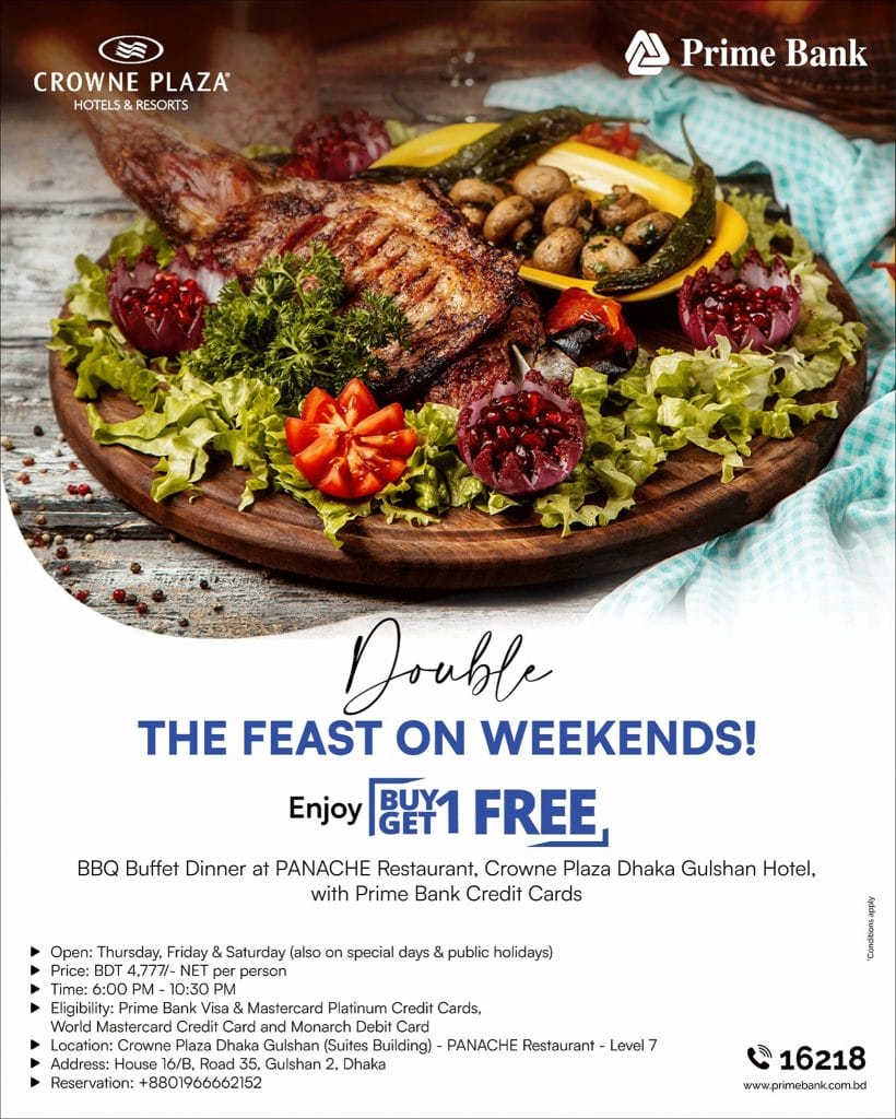 Double the feast on weekends with Buy 1 Get 1 Free BBQ buffet dinner using Prime Bank Credit Cards!