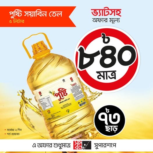 Get your hands on the premium Pusti Soybean Oil, now at an incredible price! Exclusively at SHWAPNO, enjoy a massive TK.73 discount and grab 5 liters of this top-quality oil for just TK.840 (inclusive of VAT).